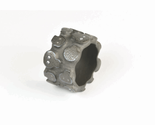 Ainsi pour Schaefer, l’excellence d’une bague sera de maîtriser la complexité et les contraintes qui président à sa création et à sa fabrication. Volume et poids, format et décor, matière et couleur, tout doit fusionner, s’équilibrer, s’harmoniser parfaitement. Dans l’exercice de cette métallurgie miniature, où la résistance d’un matériau va rencontrer la tendresse d’un autre, où les poussières elles-mêmes vont devenir précieuses, où le léger et le lourd vont sans cesse dialoguer, Schaefer se montre ardent alchimiste et du métal et de la beauté. Dans un cycle défini mais infini, il va chercher et trouver le contraste et non pas la discordance entre or et rouille, titane et argent pur, or gris et nielle, zinc et grenat pulvérisé…